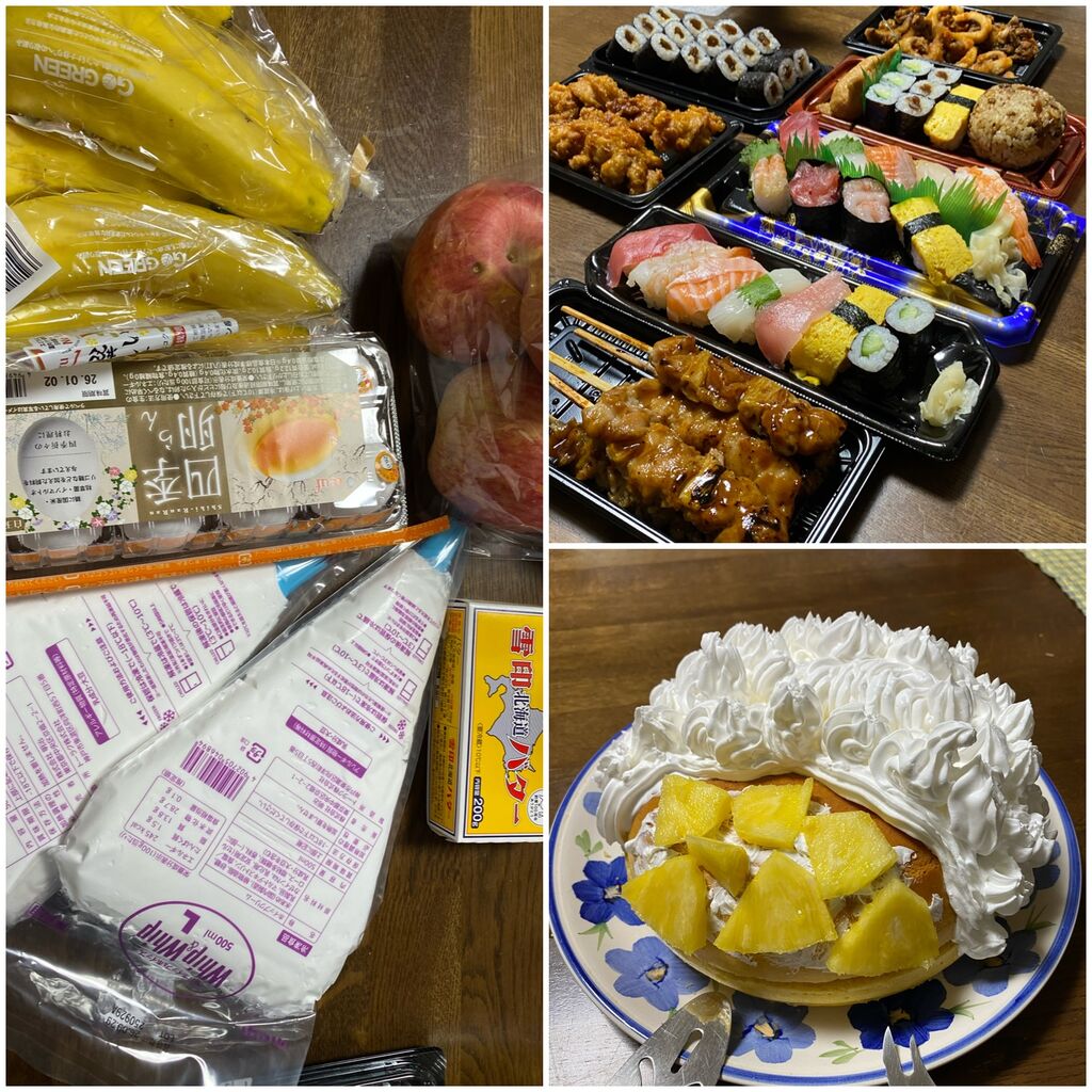 帰省している息子が帰る前にクリスマスをする事にし、買い物に行って来ました。直ぐに食べられるお寿司や、唐揚げ、焼き鳥などの他、ホイップクリームなどを購入しました。ホイップクリームはLサイズを2個買ったので、帰宅後は、ホイップクリームを使って山盛りホイップの大きな手作りケーキを作りました。クリームが苦手の家人には一部はパイナップルを乗せて。手間を掛けずに色々な種類の食材があるので大変助かります。 (訪問:2025/12/23)