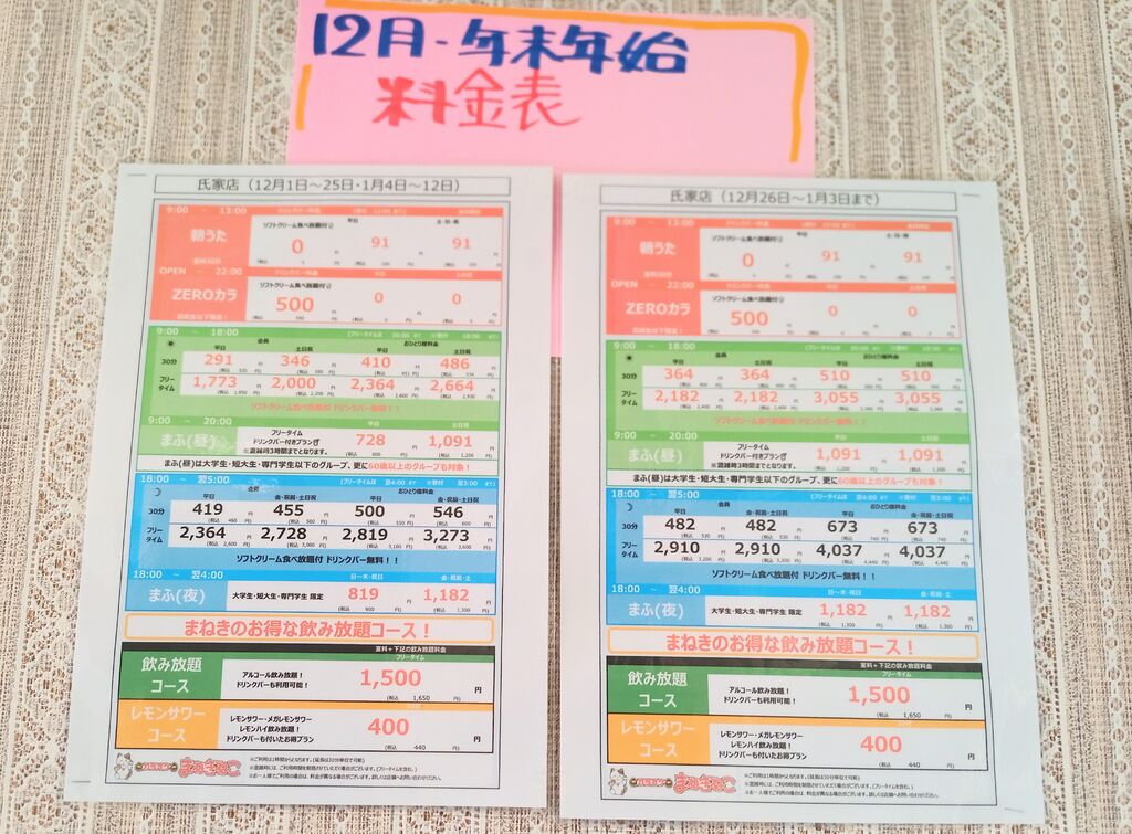 12月と1月は年末年始の特別料金になっていました。年末年始でも朝うたなら30分あたり100円くらいとお手頃価格です。高校生以下のZEROカラは550円です。ドリンクバーとソフトクリームバーも室料に含まれていました。 (訪問:2025/12/07)