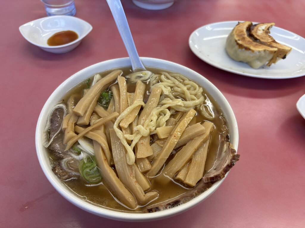 遅いお昼に、一品香今宮店さんへ。チャーシュー麺 メンマ増し、餃子3個。14時頃訪問でも激混み状態!みんな好きなんですね!この味が。チャーシューたっぷり、メンマたっぷりでボリュームありました。写真は少し食べてしまった後です。美味しく頂きました! (訪問:2025/11/08)