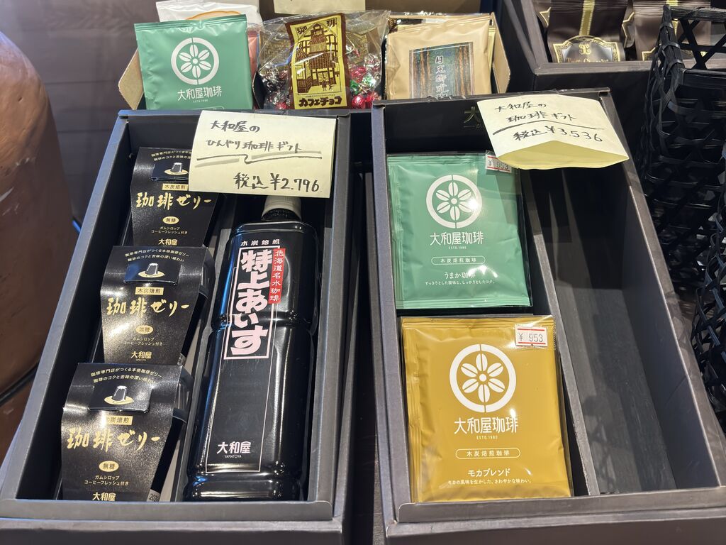 仕事を終えひと休みしてから、親戚宛のギフトを求めて大和屋さんへ 日が落ちる時間には伺ったことはなく、店の雰囲気が素敵だなとパチリ♪毎年1度、忙しい時間をさいて素敵なクリスマスプレゼントを届けてくださる方に 今年はどんな組み合わせにしようか迷いました…いつもより、色々詰め込みたく、大和屋さんを選んで大正解! ギフト箱にコーヒー豆2種(新春ブレンド・特上ブレンド)、ラム酒風味のフォンダンショコラ、金の衣、七福神のイラスト入りカフェチョコ、チャイラテとホットワインを作れるパック、素敵なイラストのかやふきんを詰めていただきました 素敵なラッピングに感謝です 閉店時間1時間切ったあたりに、4組ほどお客さまがいらっしゃり、年末を感じました次回は自分用にお買い物にしたいです (訪問:2025/12/27)