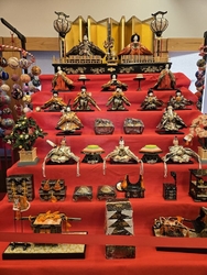 可愛い雛人形が飾られていました。立派な段飾りです。天井からは、吊るし雛も垂れ下がっており、本館内がいつもより明るく華やかに感じました。年に1度の女の子の節句、日本の伝統文化のひとつですね。入り口の看板に、おひな様めぐりというイベントのポスターがありました。期間限定で他の施設でも開催されているようです。 (訪問:2026/02/09)