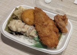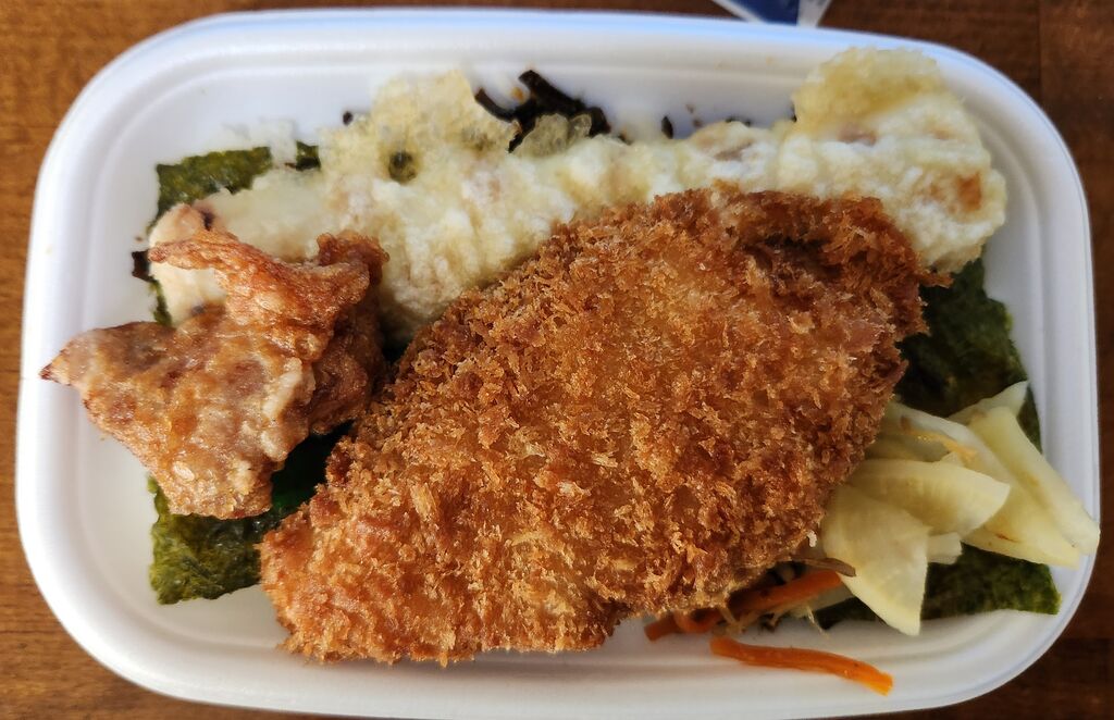無性にのり弁が食べたくなり、久しぶりに伺いました。せっかくなので「全部のせのりタル弁当650円」をいただきました。白身魚、メンチ、ちくわ、唐揚げが付いていて豪華。どれも美味しいですが、特に白身魚がふっくら柔らかくて美味しかったです。ご飯もふっくら美味しく最高。やっぱり作りたてのお弁当をいただけるのは嬉しいですね。 (訪問:2025/11/20)