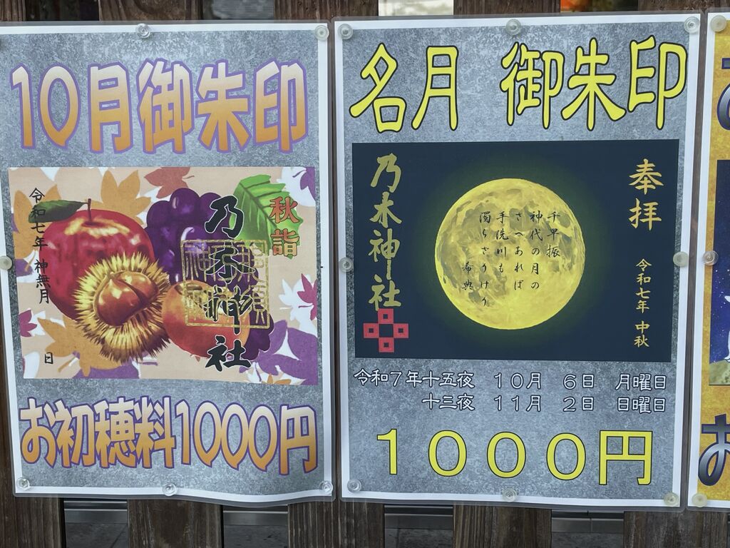 10月になり秋らしくなりましたね。乃木神社の御朱印も栗や十五夜のイラストに替わりました。今年は10月6日が中秋の名月。楽しみですね。早々と七五三のお詣りのテントも登場。乃木神社も秋の装いです^_^ (訪問:2025/10/03)