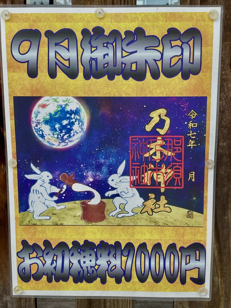 乃木神社を参拝しながら、朝のウォーキング。毎月替わるのが、この神社の御朱印。9月は十五夜のうさぎのイラスト。境内には早々と七五三参りの幟。秋は深まっていきますね^_^ (訪問:2025/09/23)