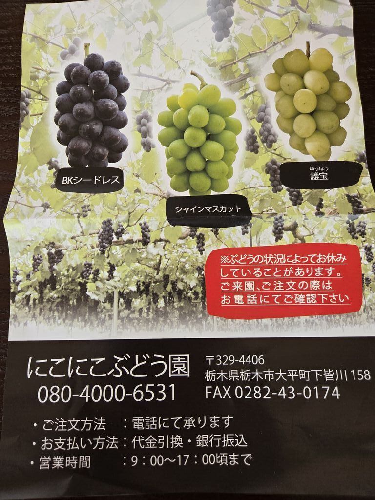 ◇ピオーネ 7月中旬~8月中旬 ◇藤稔(ふじみのり) 8月下旬~9月上旬 ◇瀬戸ジャイアンツ 9月上旬~中旬 |