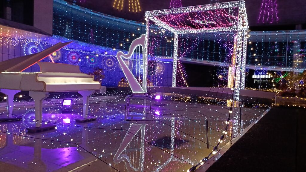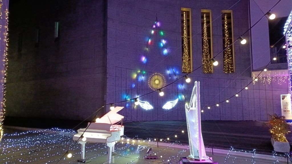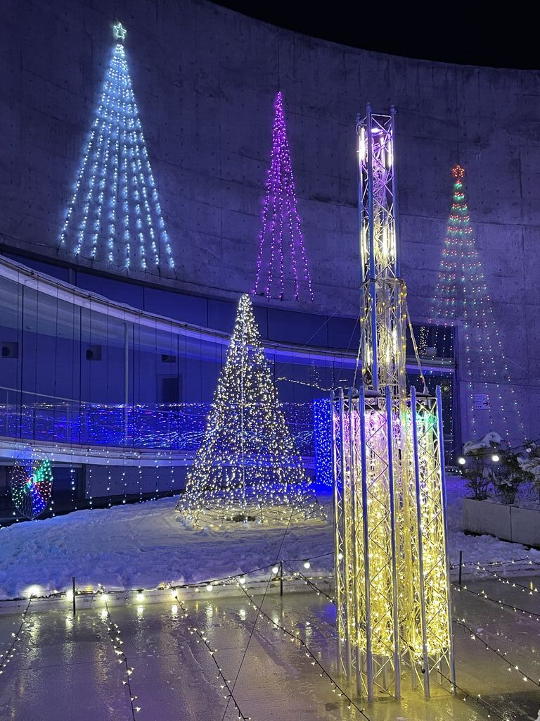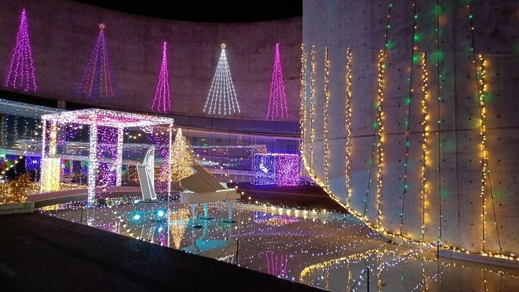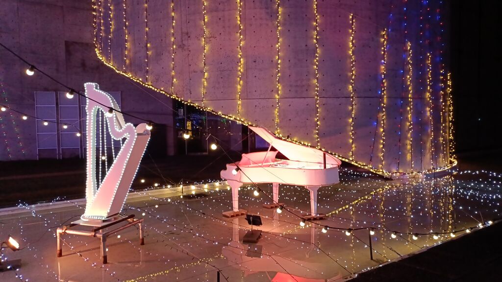 県北にドライブに行った帰りにイルミネーションをしている事を知り観に行きました。17:30からという事で駐車場で待機。時間近くになると続々と駐車場に車が入ってきました。コンサートホールらしくピアノやハープのオブジェもあり、家族連れやカップルで賑わってました。音と光のハーモニーを奏でる幻想的なイルミネーションでした。 (訪問:2026/01/04)