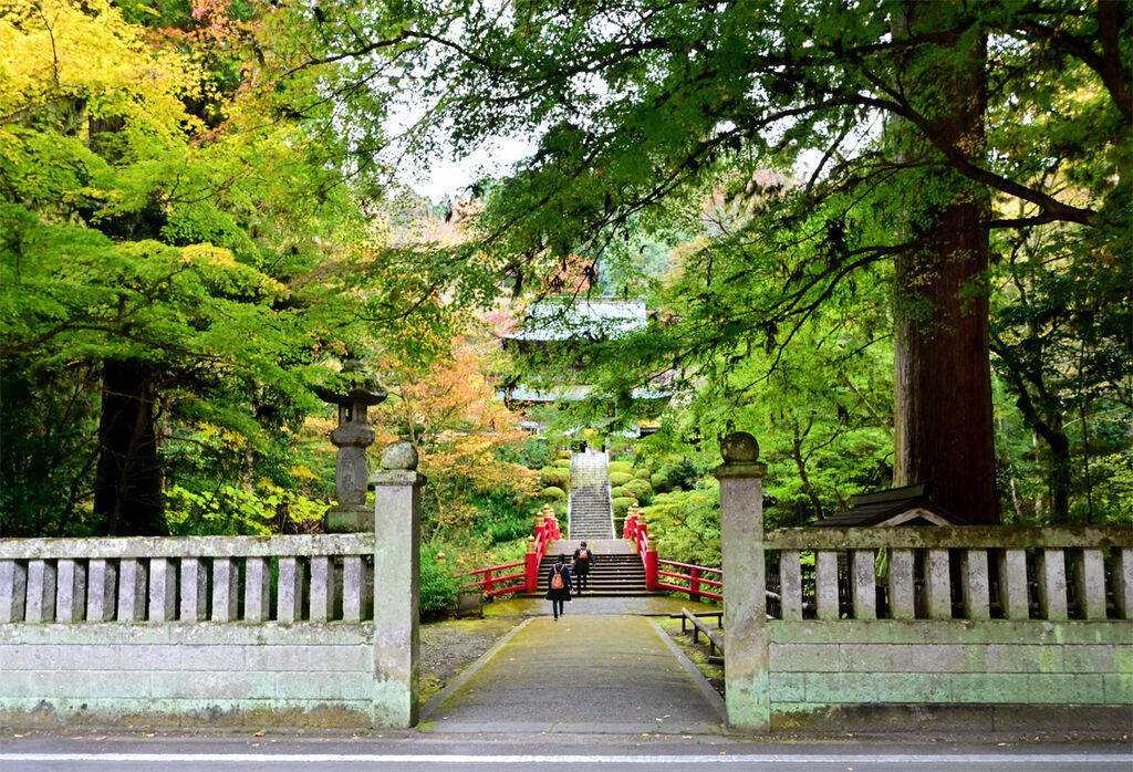 朱塗りの反り橋と奥の山門は、テレビCMでも有名になった光景です。境内は静寂さと厳かな雰囲気に包まれています。今回は11月20日に参詣しました。もうすぐ紅葉の見頃を迎えるでしょう。 (訪問:2025/11/20)