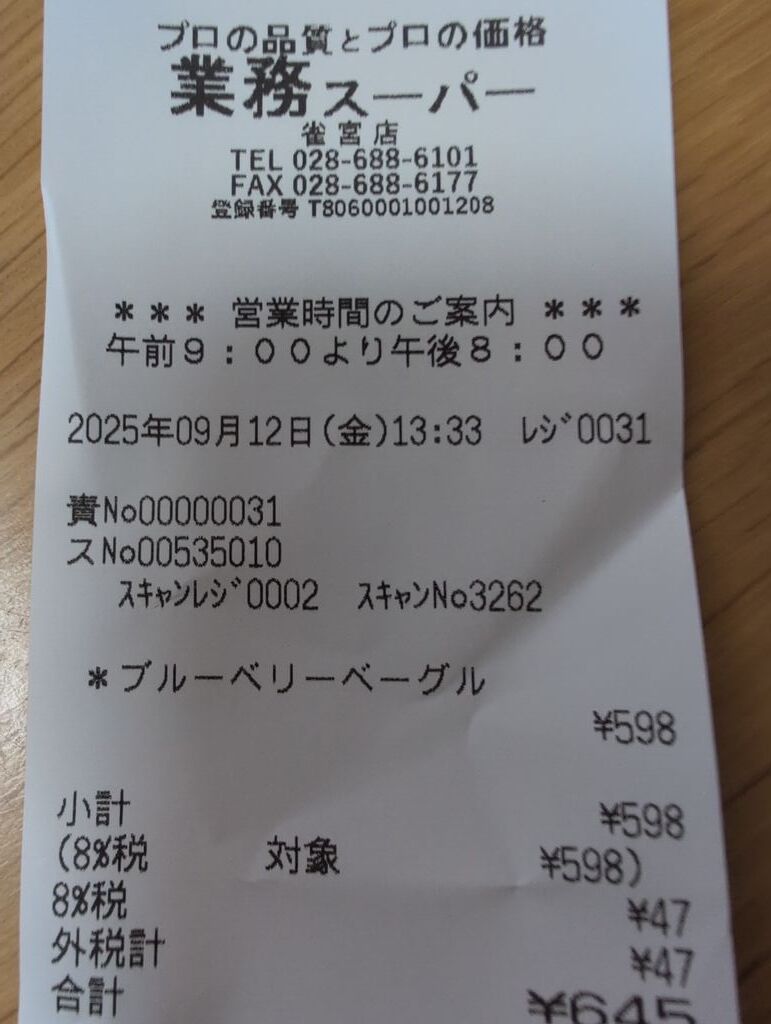 今日はタイミング良くブルーベリーベーグルが買えました。1点購入ですが現金が足りなくてクレジットカードが使えたので助かりました。 (訪問:2025/09/12)