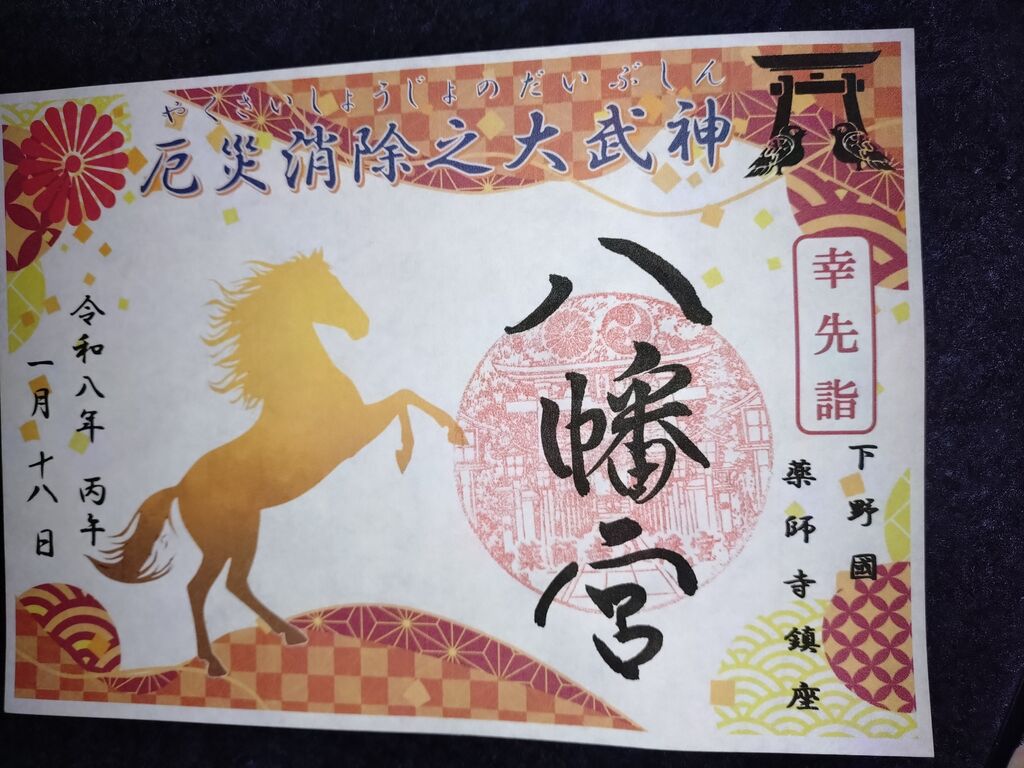 昨年末に遠くに住む両親が体調を崩したため、何か御守りを渡したくて調べましたら薬師寺八幡宮に「病気平癒御守」があると知り訪ねました。参拝後に厄落としの絵馬を購入し御神籤ひいて、有りがたい事に大吉がでました。自分用に八方除守も購入しました。御守りと一緒に御朱印もいただきました。今年1年、平穏無事に過ごせるように参拝させていただきました。 (訪問:2026/01/18)