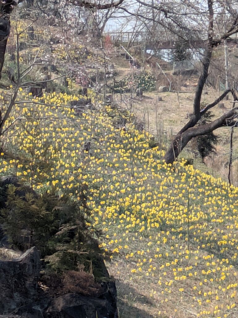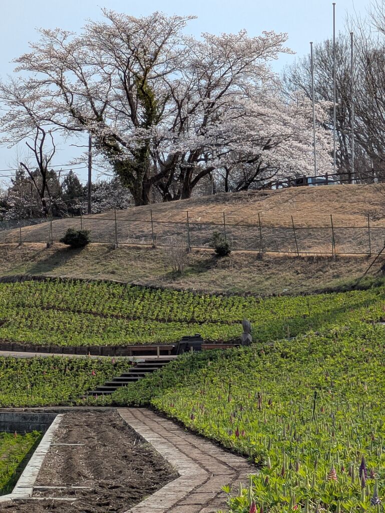 春色の草花が沢山あり選ぶのが大変です。4月1日から12日まで、およそ11万球が咲き誇る水仙フェア(フェア会場は有料)が開かれ、周りの山にも桜が咲き始めてもうすぐ春色に染まりそうです。4月18日からは見事なルピナスの花が所狭しと咲く花と緑のフェスタ2026です。ルピナスの花も少し顔を出してきていて楽しみです。(^^♪ (訪問:2026/03/29)