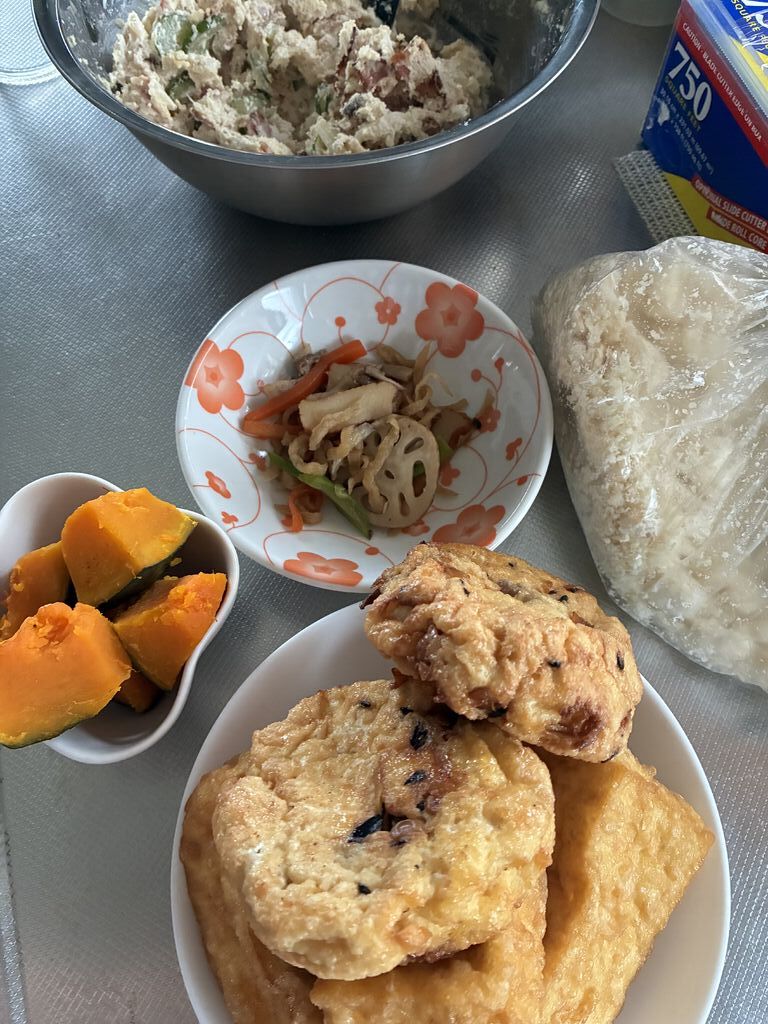 ドアを開けるとすぐにひじきやレンコンのお惣菜、厚揚げ、がんもどきが陳列されていました。厚揚げは予約が入ってるらしく2個なら売れるとのことで厚揚げ2個とがんもどき1個で390円。おからを2つください、と言うとサービスですので、と無料で2袋いただいちゃいました。おからとベーコンと玉ねぎのスライスとマヨネーズで初挑戦のおからサラダを作ってみます。 (訪問:2025/11/18)