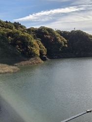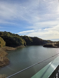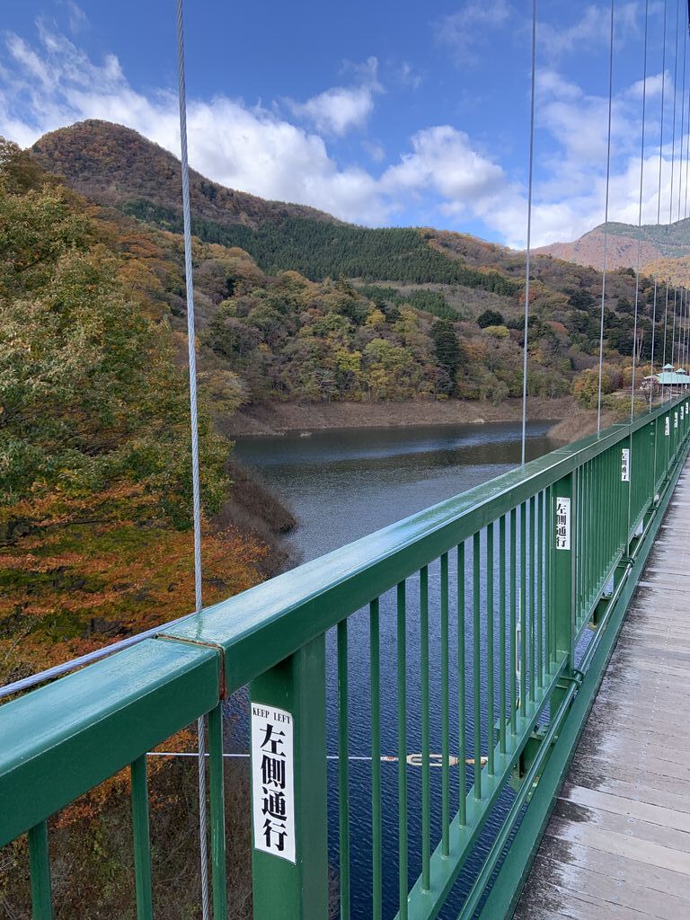 「もみじ谷 大吊橋」は「塩原ダム湖」に架かる長さ320mの橋です。歩行者が多いときなどは多少揺れることがありますが、過度の心配は不要だと思います。なぜなら高所恐怖症の私でさえ、これまでに何度も渡っているからです。今回も、途中で引き返す人はいませんでした。また、車椅子利用の方もいて、紅葉まっさかりの風景を存分に楽しんでいるようでした。橋の中央部はグレーチング(格子状の蓋)になっており、ここから下の湖面を見ることができます。 (訪問:2025/11/11)