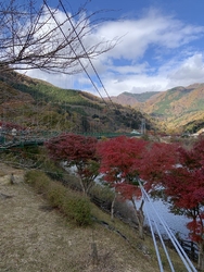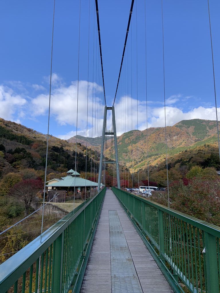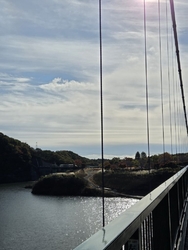 もみじ谷大吊り橋には、沢山の観光客が来ていました。有料の吊り橋です。外国人の家族も来ていました。かなり揺れるんですね。吊り橋からの眺望も抜群でした。橋を渡りきると、直ぐに、恋人の聖地の記念碑が有りました。 (訪問:2025/11/03)