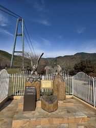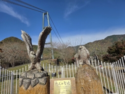 塩原温泉郷へ行く途中にもみじ谷大吊橋に立ち寄りました。大人300円で渡ることができます。全長320メートルの吊橋で見晴らしが良く緑の山々が見渡せて絶景でした。渡った対岸の広場は「恋人の聖地」に選定されていて、オスとメスのクマタカの像が設置されていました。 (訪問:2025/09/10)
