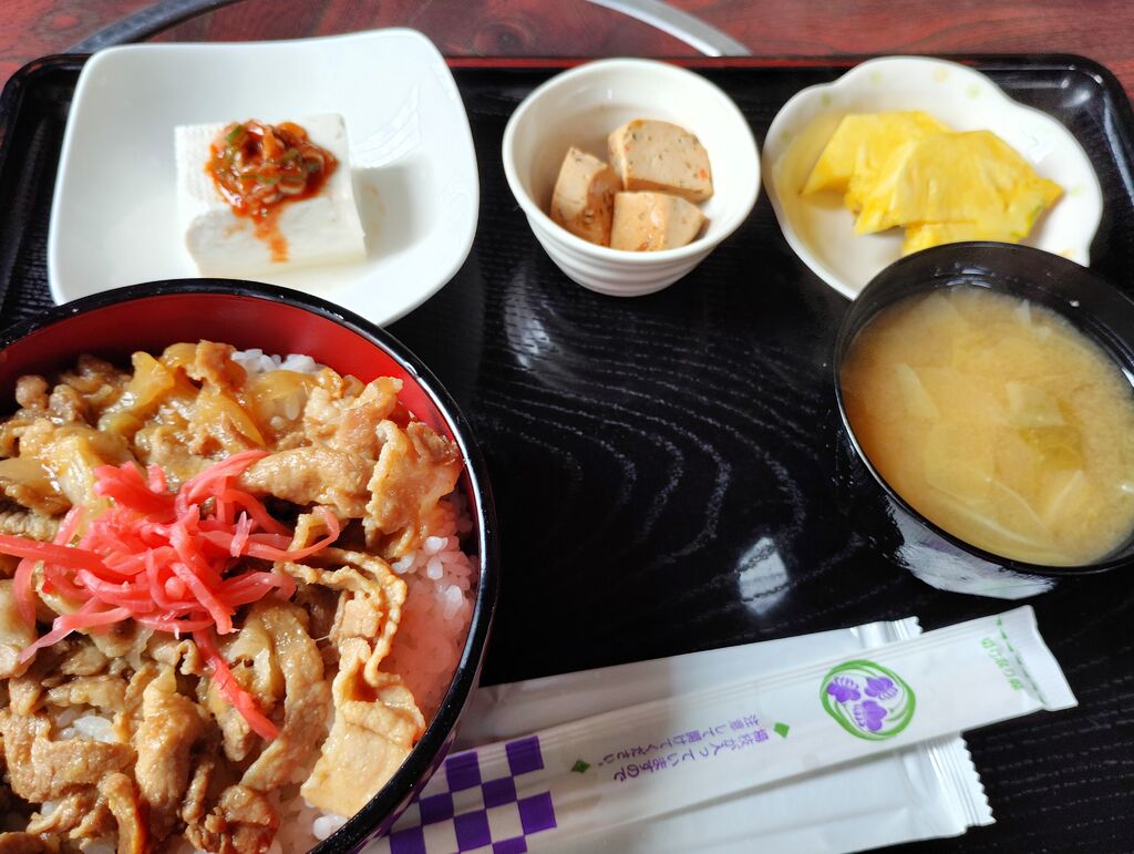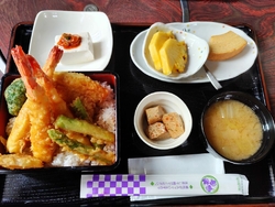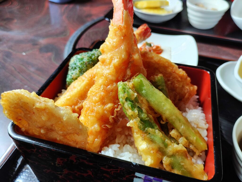 口コミを見て気になっていて、日光方面に行くときには行ってみたいと思っていたお店で、やっと行くことができました。12時過ぎに着いたら駐車場がいっぱいだったので、ちょっと時間をつぶしてから再訪。13時前に着いたらすぐに入れました。入口にメニューの看板があり、先に注文&会計を済ませたら番号札が渡されるので、出来上がったら自分で取りに行くセルフ式のお店です。私は「天重セット」連れは「豚丼セット」を頂きました。“天重”は揚げたてサクサクで、海老3本・レンコン・アスパラ・ブロッコリー・キスの5種類。小鉢に冷奴・デザートにパイナップルとバウムクーヘンが付いていてボリューム満点。コーヒーも1杯無料で付いています。女性客には注文の際に「ご飯の量が多いです」と声掛けしてくれるようで、気遣いが嬉しいですね。また一つ、お気に入りのお店が増えました(*'▽') (訪問:2025/08/28)