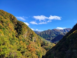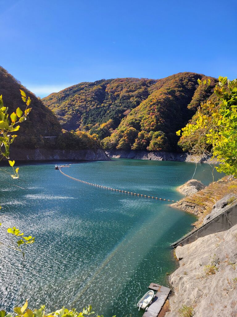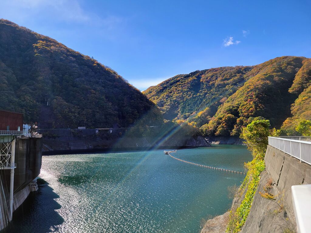 川治ダムに行ってきました。周辺の山が色づいて、とっても良い雰囲気♪日が当たると碧く光る湖面も、本当に美しかったです。 (訪問:2025/11/02)