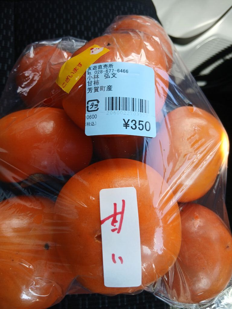 しばらくぶりに、温泉に入ってから買いに来ました。くだものを探していると、おじいさんが、柿を並べているのが見えて、たぶん富有柿と思いますが、350円で10個入っていたので、迷わず1袋買って来ました。帰ってから食べましたが、うまかったです。ごちそうさまでした。 (訪問:2025/11/28)