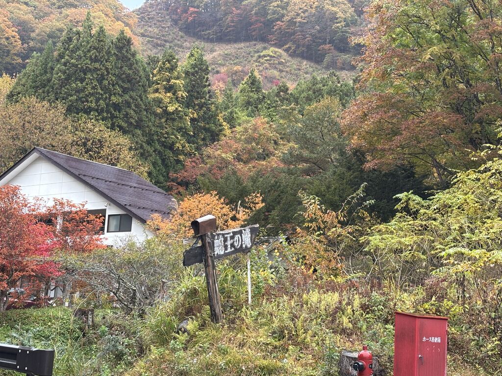 お食事処やしおさんで食事をし敷地内から通ずる遊歩道入口から鬼怒川の川原へと向かいました。降りてスグに石垣のような物が横一線に積み上げられております。恐らく土留めでしょうね。歩いて3分程で河原を目前にした広場に到着です。ここから2m程下の川原に降りようとしましたが落ち葉が堆積し滑りまくりで断念しました。それなので木々の間から滝を眺めました。木々の葉が色づく中で捻りながら落水する光景が印象的でした。滝が一層綺麗に見える季節の到来です。 (訪問:2023/10/21)