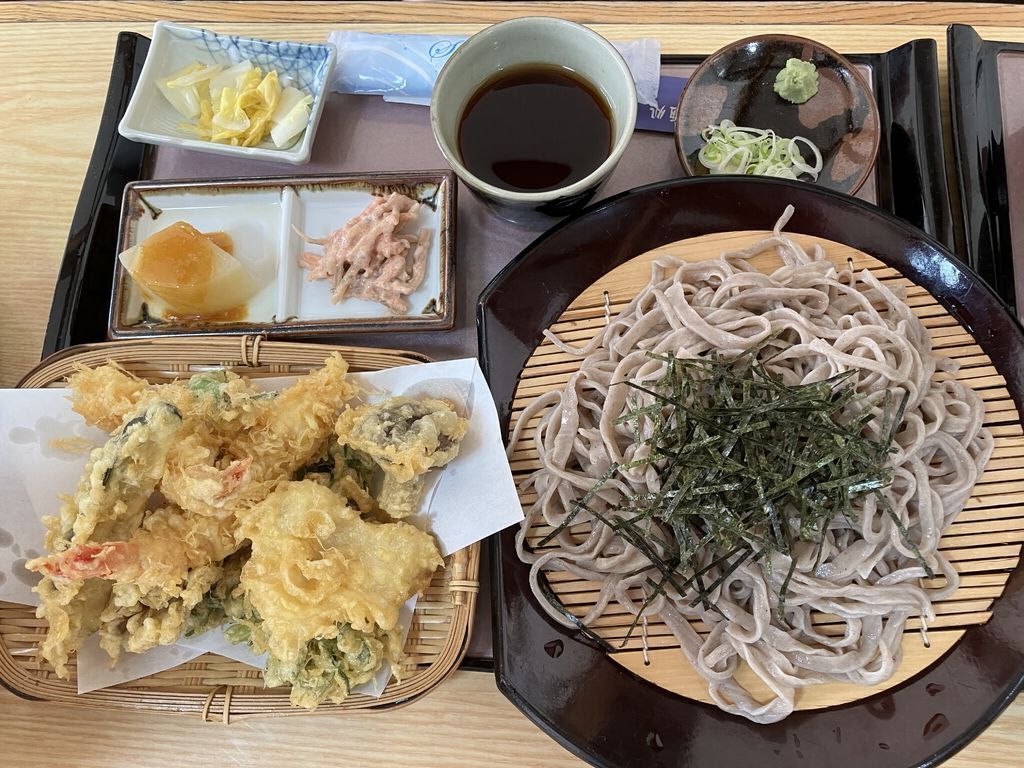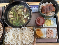 妻とランチに行ってきました。夏限定の・冷やしタヌキ(蒸したエビ入り・そばの腰が最高)+山芋丼(卵とマグロのブツ切れ)・チタケうどん+うな丼を頼みました。更に 小鉢3個と味噌汁が付いてきました(タケノコの煮つけ+ゼンマイ+胡瓜とハムの炒め物)何て豪華なのでしょう まずは目で堪能、さてお味は どれを食べても美味しかった。ボリュウーム満点で大変満足致しました。料金は 各1080円(消費税は内税)2160円でした。次は 大エビフライを注文しようかなァ!!! (訪問:2018/06/20)