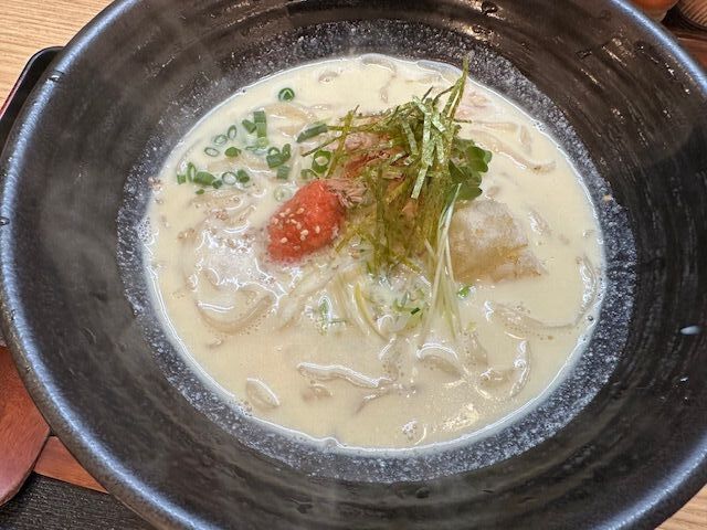 ず〜っと行きたかった花むすびさん、よーーーやく伺うことができました。11時10分くらいに到着すると、すでに駐車場は残り2.3台…すぐに受付を入口の発券機で済ませます。少し待って入店する際、次回使える揚げ物券を引かせて頂きました!初めてなので、メニューの上二つを注文。【岩のりと背脂の肉うどん】は辛さを追加しました。しっかりとした辛さがあり、癖になる背脂感!でも、思ったよりあっさりで、岩のりがほんのり香りました。【豆乳明太うどん】はまさに豆乳!明太子を溶かしていい具合に。ネギが良いアクセントで、スープが止まりませんでした。どちらもアツアツで、顔に汗をかきながらあっという間に完食でした。他のメニューも気になります!また伺いたいと思います。ご馳走様でした。 (訪問:2026/02/23)