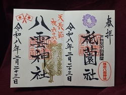 新年明けてのお参りにとお昼前にお邪魔しました。境内はちょうどお帰りになる方が居たくらいで、他に参拝客はなく、独占状態でたっぷり時間をかけてお参りさせていただけました。6柱の神様にしっかりとお参りしたあと、裏手の摂社にもしっかりと。仕事関係から様々なことをお願いさせていただき、とりあえずひと安心な気分に♪社務所で天皇陛下のお誕生日にあわせたその時期限定の御朱印と、祇園社ゆかりの日にあわせた、こちらも限定の御朱印を、せっかくなので賜りました^^ちなみにこちらの御朱印に押印されている可愛いスタンプ、細川興元公以外は全て手作りの消しゴムはんこなんだそう。いつも可愛いスタンプだなぁ、どこで買うのかなぁと気になっていましたが、まさか手作りとは。楽しませようと素敵なデザインを作ってくださる姿に愛を感じますね。また社務所内良い香りがすると思えば、去年いただいた焼きいもがスタンバイ!これはぜひお友達のお宅へ差し入れに!と『焼き芋1000円』分をゲット。お友達も美味しいと絶賛‼神社の焼きいも、美味しいご利益満載です。 (訪問:2026/02/23)
