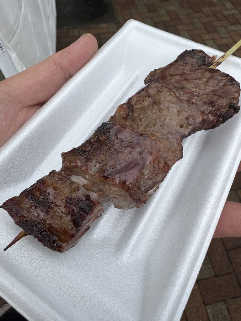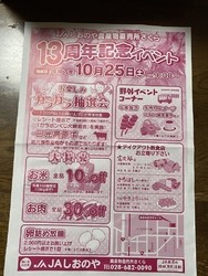 13周年記念イベントに10時過ぎに行って来ました。寒くて霧雨が降っていましたが到着した時には大勢のお客様が、ガラガラ抽選会に並んでいました。早速館内に入りネギ、ピーマン、さつまいも、にんじん、玉ねぎ、じゃがいも2種、生しいたけ、キウイを購入。1000円以上買うと引ける抽選会は空いて、卵詰め放題などは終わっていました。引く事が出来た抽選では国産小麦のもちもちミルクパンを頂きました。館内で母と買い物をしている時、同行の息子は野外イベントコーナーで牛串焼きを楽しんでいて、美味かったと言ってました。イベントに行く事が出来て楽しかったです。 (訪問:2025/10/25)