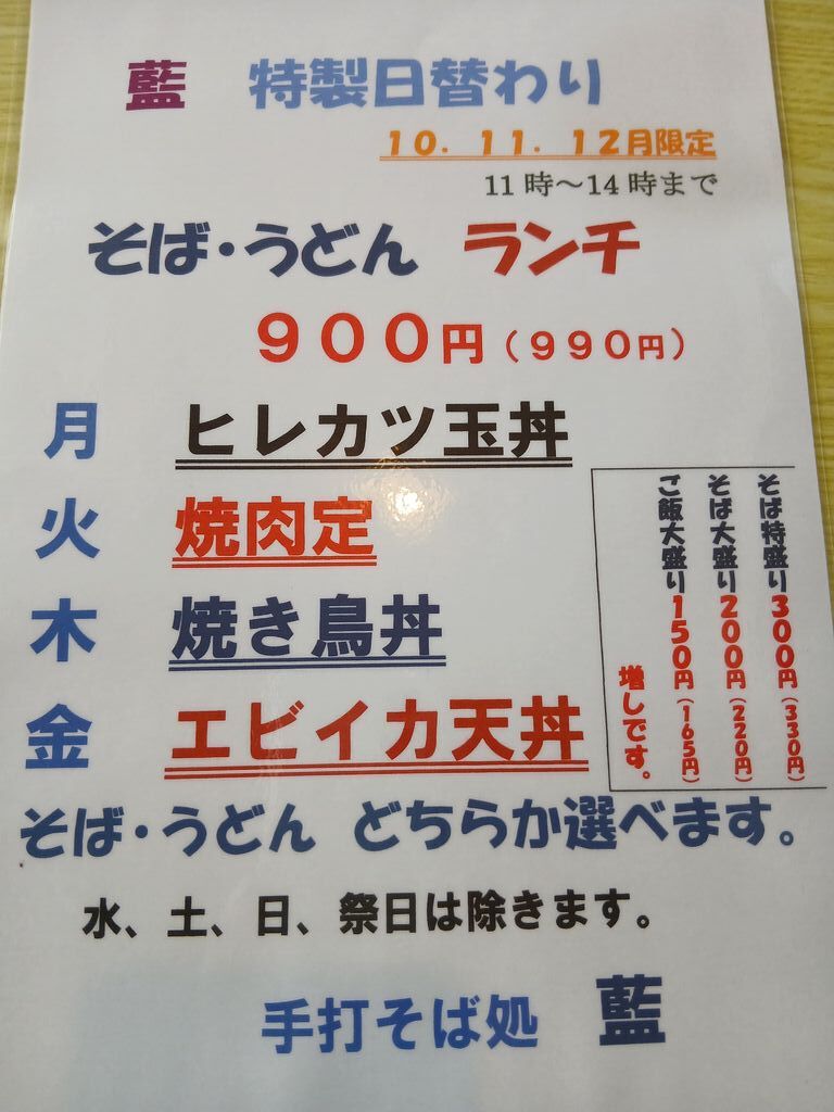| ◇藍特製日替りそば・うどんランチ 日替りの丼や定食+そばorうどんのお得なランチメニューです。 |