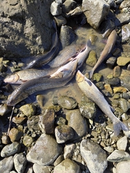 健康のために続けてるウォーキング。午前中に行きました。この日は天気も良く、雪が積もった男体山がよく見えました。このところ雨が降ってないせいか、思川の水がかれて水が引いてました。川の階段を下まで降りてみると、かなり水が減っていて、魚が素手でも取れるくらいの水量でした。おじさま達が、網で川魚を取っていました。大きい鯉のような魚から小さなメダカのような魚まで、たくさんの魚がました。隣の水溜まりでは、サギなどの鳥が魚をつついて食べていました。いつものウォーキングが、また違って楽しめました。 (訪問:2026/01/28)