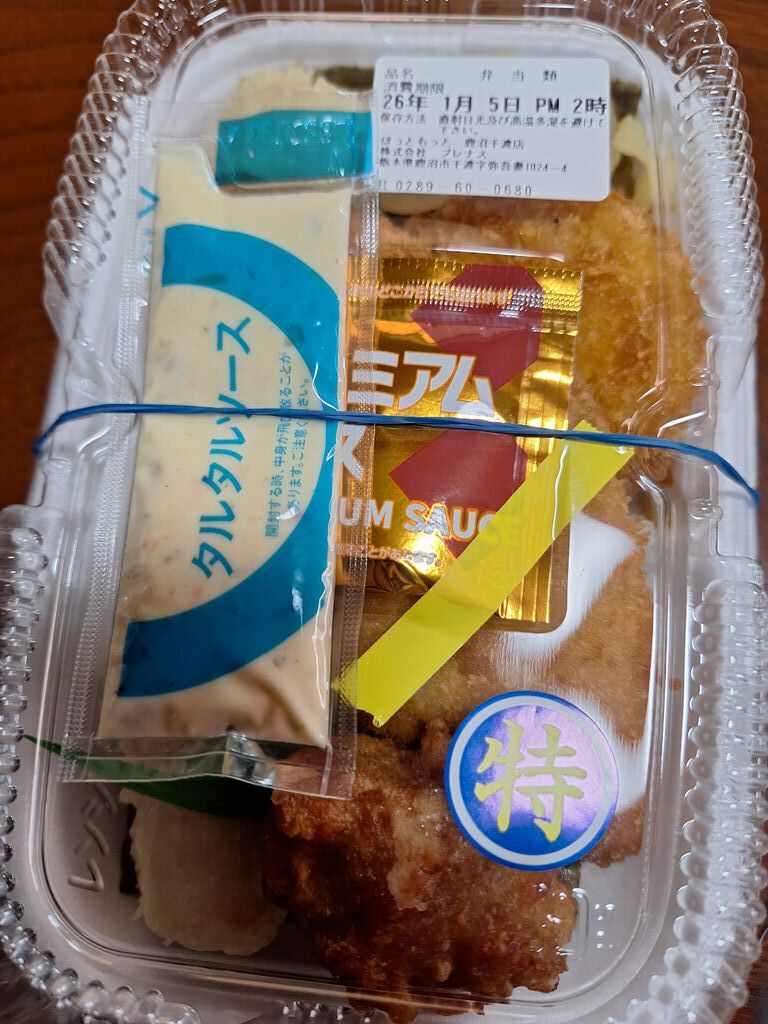 衣がサクサクッとした白身魚フライののり弁が食べたいと思い、こちらへ…☆「全部のせのりタル弁当」を注文。別添の”プレミアムソース”と”だし醤油”を選べて、”プレミアムソース”にしました。ごはんの上に、のり、白身魚フライ、大きなちくわ天、メンチカツ、から揚げ、きんぴらごぼう、たくあんが乗って、おかずたっぷり、ボリューム満点です。少食な母は、2食分だと言っていました。お昼時は待っている方々がいましたが、私はネット予約していたので、お先にサクッと受け取りでした(^ー^) (訪問:2025/12/22)