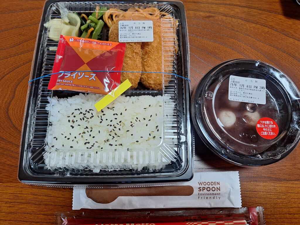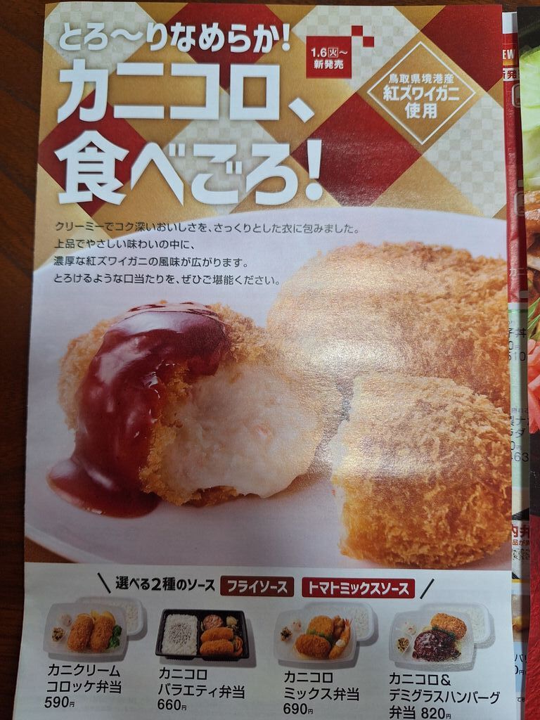 新登場“カニコロバラエティ弁当”を早速食べました☆紅ズワイガニの旨味とコクのあるクリームソースが一体となったとろ~りなめらかな冬のごちそう洋食メニューです!同日新発売の北海道産小豆100%使用“あったか白玉ぜんざい”もお弁当と一緒にテイクアウト。柔らかくもちもちとした白玉が、ほどよい粒感のぜんざいと絶妙に絡み合って美味しいです。初登場のほっとスイーツをぜひ食べてみてください(^ー^) (訪問:2026/01/08)