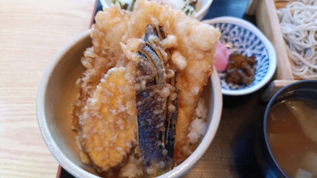 開店と同時に何人かお客さんが入って行き、お昼時もあってメニューを見て悩んでいたら次から次へと席が埋まっていましたぁ~(笑)その中で《ミニゆば天丼セット¥1100》をオーダー♪ゆば2枚、なす、さつまいもの天ぷらが豪華に彩っていて甘ったるいタレに染み込みながらも、それぞれの素材の味を生かしていた~٩( ᐛ )و私好みの味タレだったので箸が止まらなかった(笑)ゆばの天ぷらは外はサクサクで中は柔らかな食感。控えめな大豆の自然な甘みと風味を感じました。蕎麦は噛み応えあり しっかりしたコシがある食感。蕎麦つゆは濃すぎないさっぱりした味付けで最後の蕎麦湯も満足でした(*•̀ᴗ•́*)و ̑̑味噌汁、サラダ、お新香付きで サラダのドレッシングは《ふくふくドレッシング》お店の手作りらしく地元の柚子を使用していて玉ねぎのコクのある甘さと、柚子の爽やかな味でさっぱりと頂けました~(笑)12月~値上げしたらしいですがコスパは良いと思いますꉂꉂ(ᵔᗜᵔ*) (訪問:2025/12/08)