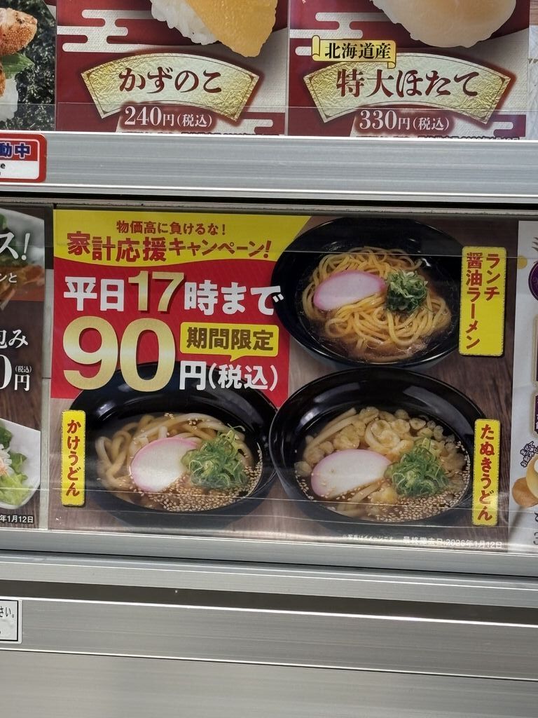 午前中から業者さんが来ていて、帰られたのが14時でおなか減った~!娘たちと夕方の予定までに買物を済ませたいと、ササっと食べられる魚べいに。席について気になったのが「平日ランチタイム限定のランチ醤油ラーメン(ハーフサイズ)が90円」!あまりお寿司屋さんでサイドメニューや麺を頼まないのですが、気になって注文したら、シンプルだけど美味しかった~♪チェーン寿司店の麺類侮るなかれ!期間限定のオレンジパフェで締めて夕方の予定もバッチリでした。ごちそうさまでした~! (訪問:2025/12/25)