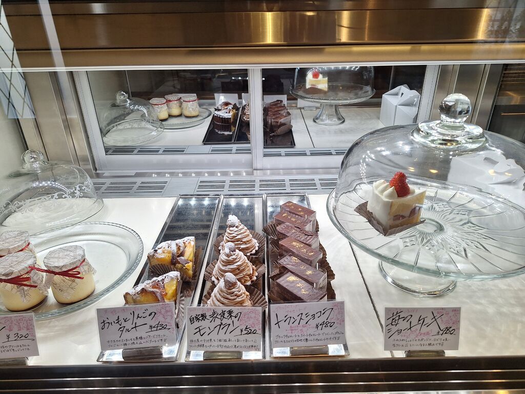 美味しいケーキとお茶をいただきたく16時頃お邪魔しました。駐車場はほぼ満車だったのでイートインは無理かも…と諦めつつ入店しましたが、カウンターが空いてる‼ケーキの種類は少なくなってましたが、どれも美味しそう。席に着く前にジーッとケーキを選び着席。メニューを拝見すると『ケーキセット(ケーキ2つ+紅茶)1290円』があり、ずーっとトランスショコラ、ヴァニーユフリュイの2つで悩んでいたので嬉しい限り!3個までチョイスできるセットがあり、きっと私のような客が多いんだろうなぁとニヤリしてしまいました。素敵なティーカップが目の前に置かれ紅茶もスススっと流れるように準備、あわせてケーキも登場。チョコ系とバニラムースの2種で、チョコ系のケーキも見た目のわりに甘さ控えめであっさりしており、くどさなし。思ってる以上に軽い食感でペロリといただけちゃいました♪ヴァニーユの方はたっぷりのフルーツとバニラムース、このムースとフルーツが全く喧嘩することなく、フルーツの甘酸っぱさとバニラの甘味が見事☆食べ応えもあり満足感もバッチリ!美味しい逸品です。ティーポットでの提供の紅茶も、二杯以上楽しめる量があり、満足感バッチリのケーキセットでした^^ぜひまた美味しいケーキセットを満喫しにお邪魔したいです! (訪問:2024/12/14)
