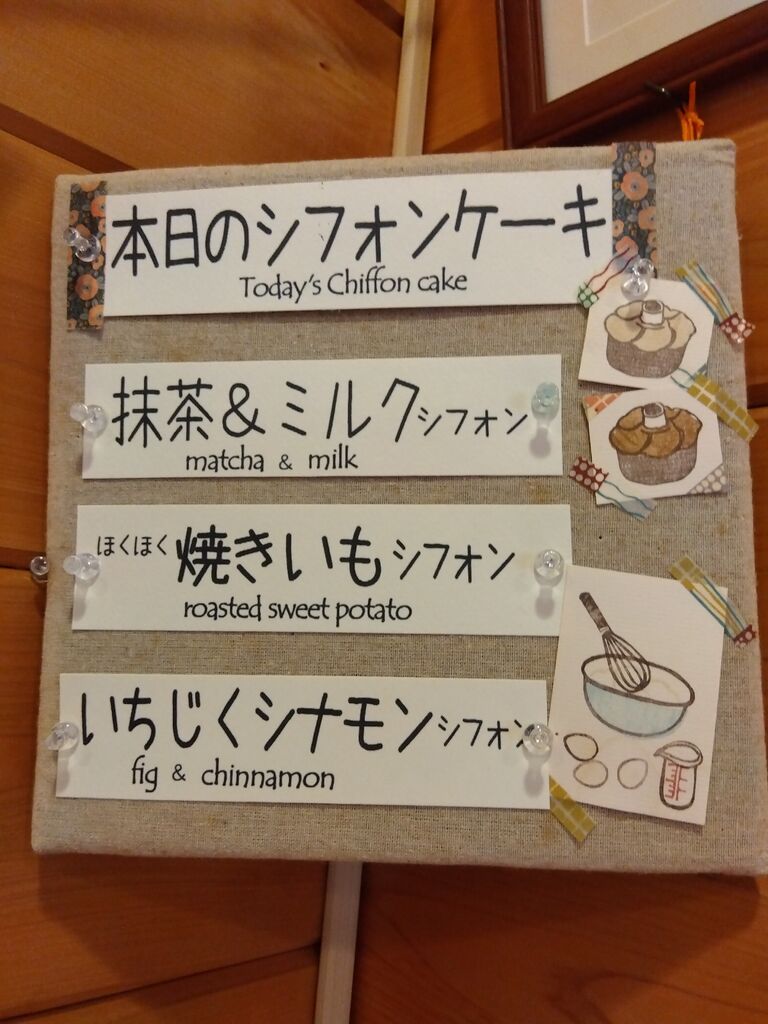 | ◇選べるケーキセット(ケーキ + コーヒー or 紅茶) *ふわしゅわシフォンケーキ(バナナ等3種類)しっとり濃厚ガトーショコラ の中から1品をお選びいただけます | 750円 |