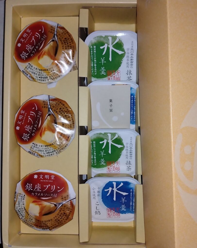 手土産で<文明堂詰め合わせ>をいただきました♪水羊羹と銀座プリンのセットです。プリンは文明堂さんならではの唯一無二の味わいで、カラメルも甘さ控えめです!水羊羹はぷるんとして、喉越し良く美味しくいただけました♬ (訪問:2025/08/24)