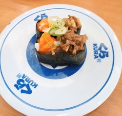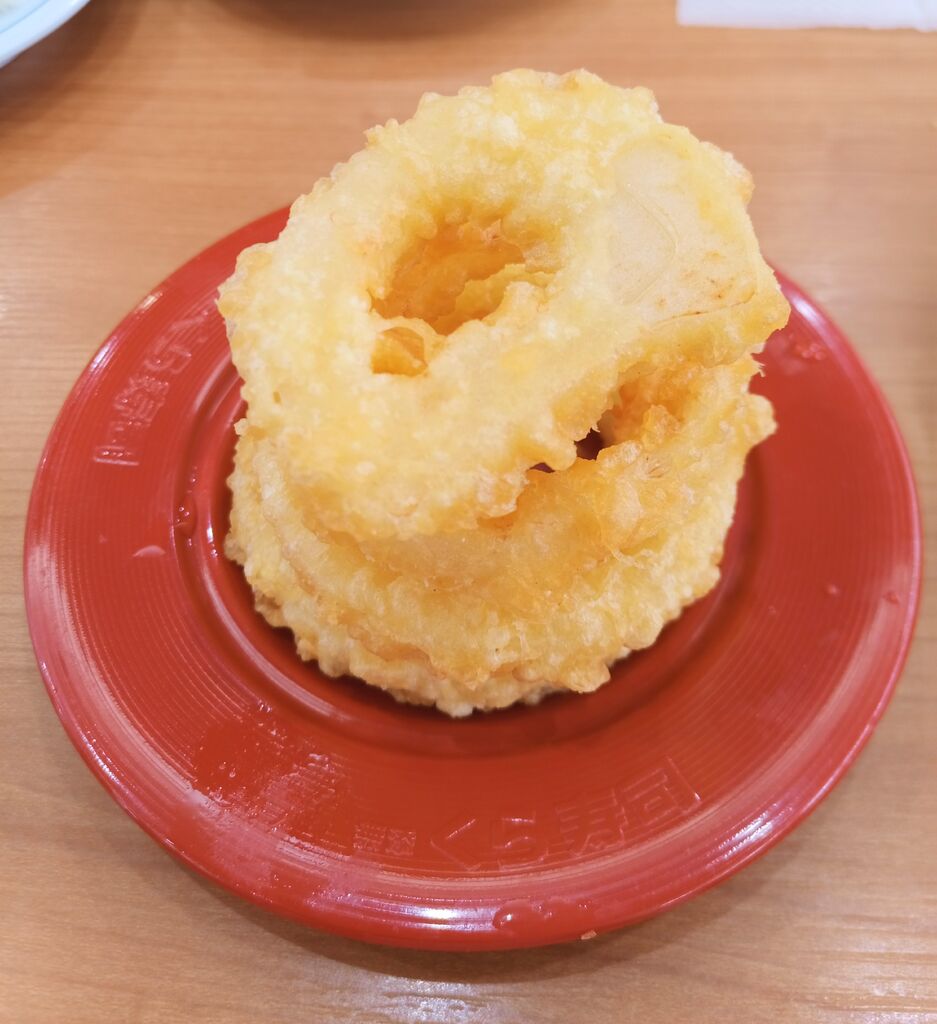 牛すき焼き風軍艦、旨だれ牛カルビのお寿司、海老のお寿司を注文しました。サイドメニューのオニオンリングも美味しいです。スマホから注文するとスマホからビッくらポンの抽選ができ、抽選できる回数が増えます。 (訪問:2025/09/06)