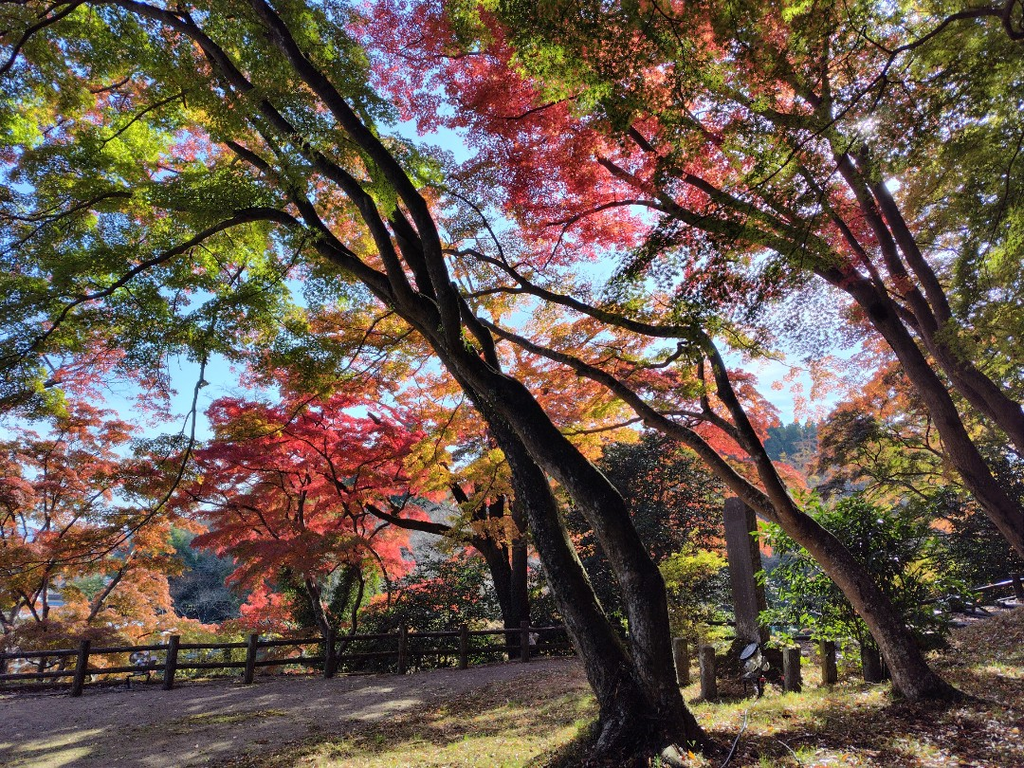佐久山の御殿山公園に行ってきました。モミジの紅葉目当てにいきましたが、色づきはじめと言った感じでしたが、色づいてない緑から紅葉した真っ赤なモミジ、それと黄色に色づいたイチョウを楽しむことができました。モミジ祭り前でしたので人も少なく、独り占めできました。 (訪問:2025/11/08)