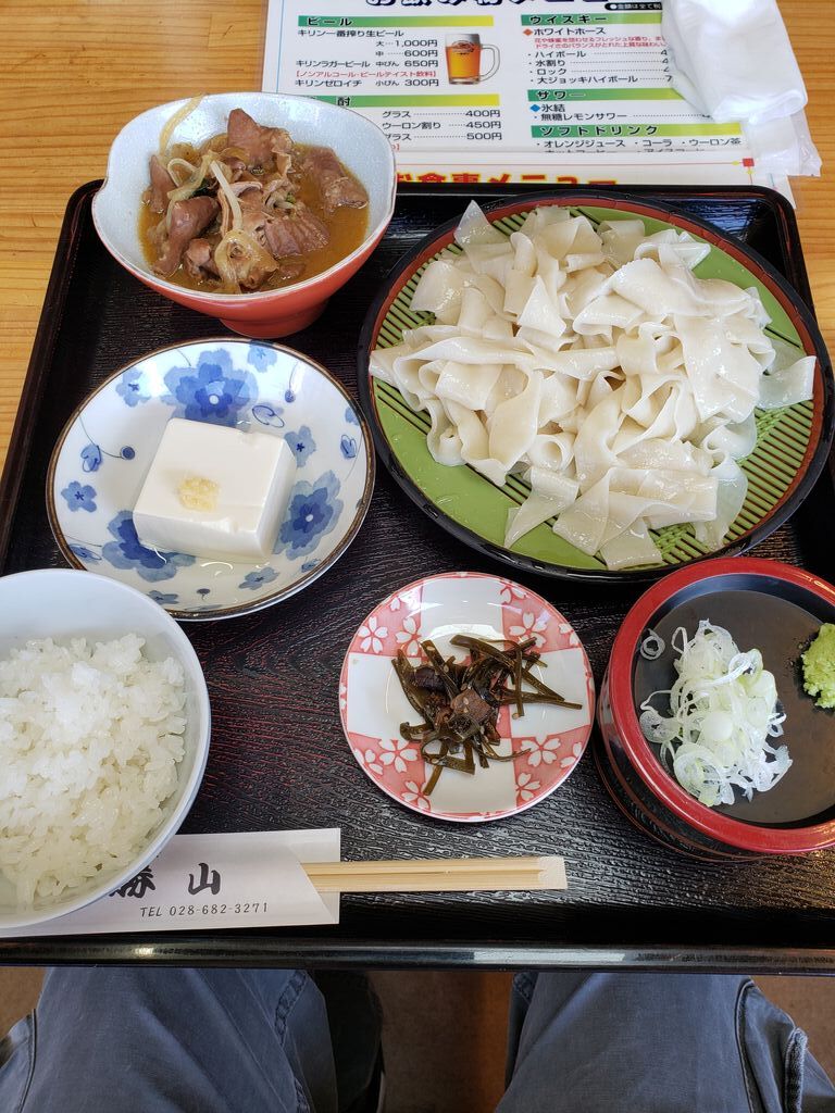 ざるうどん(氏家うどん)と半焼肉、半ライスの定食をいただきました。平たくて喉越しが良い氏家うどん、やっぱ最高♪焼肉も柔らかくて元気 出ました! (訪問:2025/09/21)