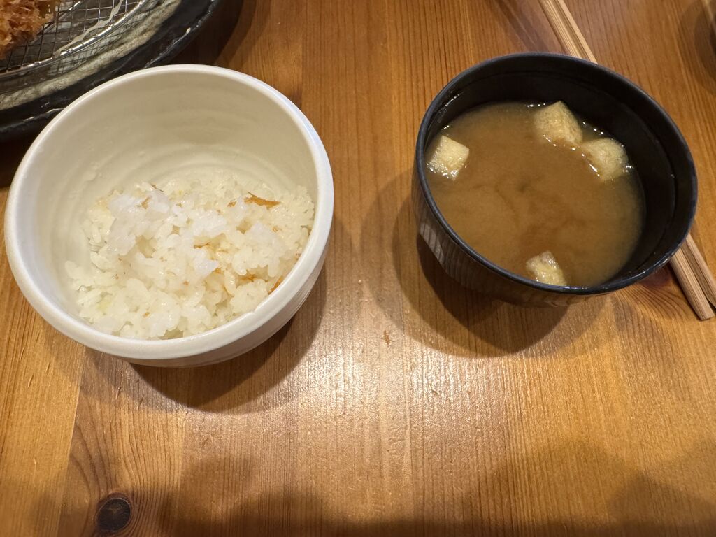 久しぶりに伺いました。ヒレカツランチとロースカツランチを注文。お冷やの入ったビン、お冷や、前菜がきました。前菜は大根か冬瓜のそぼろ煮、ポテトサラダ、きんぴらでした。鶏肉は苦手だけど美味しくてあっという間に間食。カツ、ご飯、お味噌汁もきてサクサク衣のヒレカツは柔らかくて脂っこくなく箸が進む。お味噌汁は好きな具ばかりで嬉しい。食後のホットコーヒーもいただいて大満足です。ご馳走様でした。 (訪問:2025/09/14)