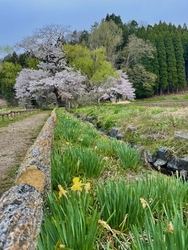 この時期の遊行柳。新緑柳とピンクの桜が両方楽しめます。アプローチの畦道にはスイセンも。春になり、急にカラフルになります。元気を貰える感じです^_^ (訪問:2025/04/18)