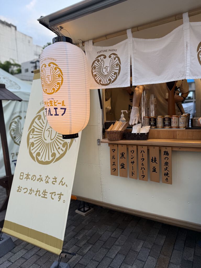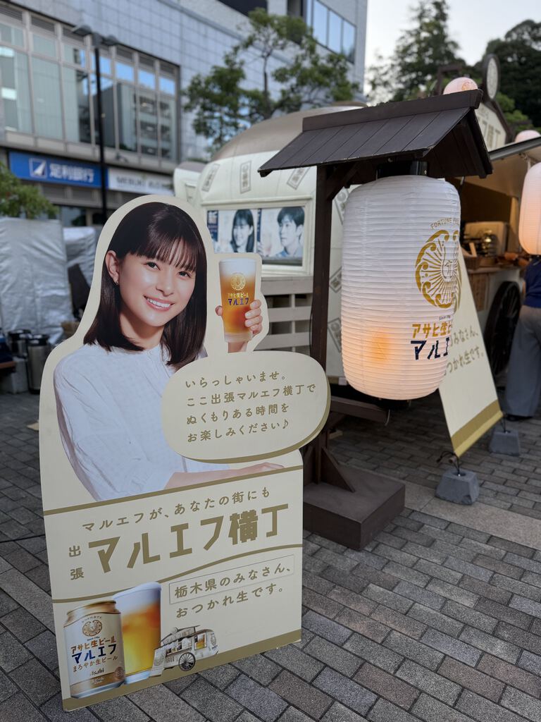 バンバひろば(宇都宮市バンバ市民広場)に”日本のみなさん、おつかれ生です。プロジェクト「マルエフ横丁 in 栃木」”が来てくれました(*´-`) 6月27〜29日にマルエフカーが期間限定オープンしていて、買い方などスタッフの方が丁寧に教えてくださいました♪ 基本的にテントスペースで飲食できますが、アサヒ生ビールのテイクアウト(お通しなし)もできました☆ (訪問:2025/06/27)