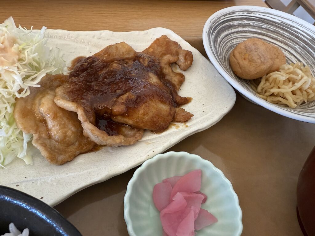 生姜焼き定食(¥1,300)を食べました!ご飯が進む味でとっても美味しかったです♪付け合わせのがんもは甘めの味、切り干し大根は酢の物担ってました!お味噌汁は豚汁で食べ応えがあって良かったです! (訪問:2025/10/23)