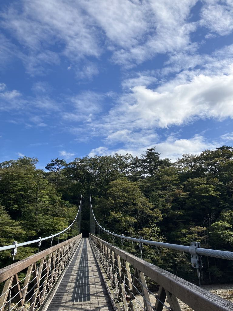 数回訪れていますが、吊橋を実際に渡ったのは初めて。ひゃぁ〜(ᗒᗩᗕ)ドキドキバクバク心臓が鼓動をうちはじめました。そろりそろり下を見ずに渡りきると階段が...よっこらよっこら昇りきると塩原ビジターセンターが見えて「ここに繋がっているのね」と、凄く驚きました。新たな発見。そして真っ赤に染ったモミジ。あっぱれ‼‼‼自然の織りなす景色に酔いしれました。 (訪問:2024/11/17)