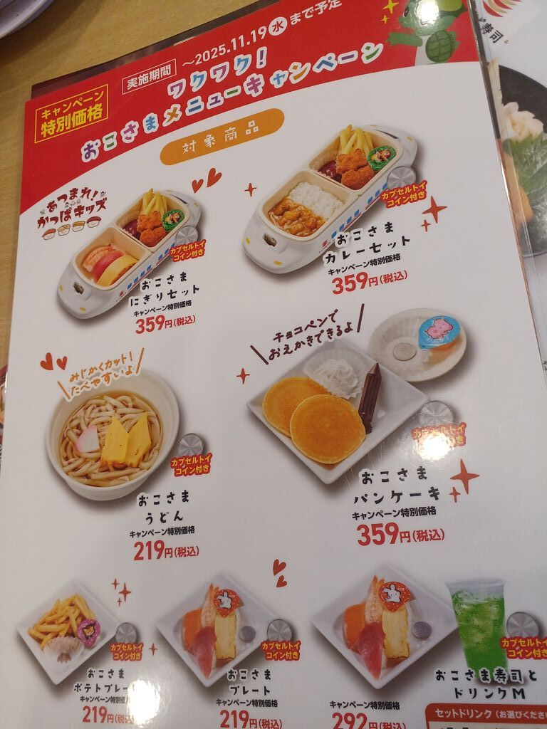 頑張った日のディナーは回転寿司が多いです。ちょうど子供向けメニューがお得になっていてラッキー。おえかきパンケーキ、楽しそうでした。かっぱ寿司のサラダ軍艦は、濃厚でクセになるおいしさだと思います。かっぱ軍艦は、食感がおもしろかったです! (訪問:2025/10/17)