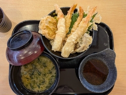 贅沢大えび天丼・あおさの味噌汁セット税込み1,140円をいただきました。天丼ではありますが、ごはんが酢飯と言う、お寿司屋さんならではのこのメニュー、ずっと気になっていましたが、今日やっといただくことができました。他のメニューを見ることなく、このメニューをぽち。10分足らずの待ち時間で、贅沢で豪華な天丼到着です。大えび・まいたけ・おおば・さつまいも。季節の天ぷらてんこ盛り。さくさく衣で超美味。ごはんもまじおいしい。酢飯と天ぷら、すごいよく合います。天ぷらの脂っこさをすべて消してくれます。赤酢シャリ、ブラボーです。あおさの味噌汁もおいしい。香りもいいし、風味もいい。広々したテーブル席で、ゆったりとおいしいランチいただきました。 (訪問:2025/11/14)