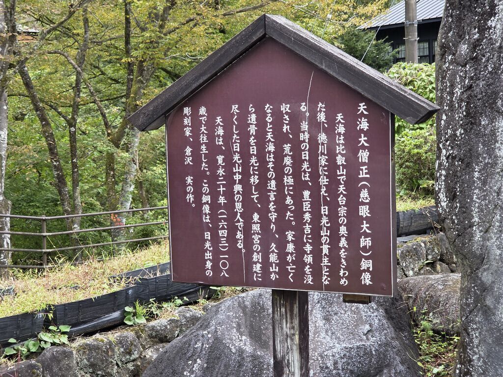 日光観光から帰る時に必ず通りから見守る様に私たちが、目にする銅像が、天海大僧正の銅像なんです。天海大僧正は、東照宮の創建に尽力し、なんと108歳で大往生した当時としてはすごい長寿ですね。日光創建のシンボル的存在、日光中興の恩人です。 (訪問:2025/10/19)
