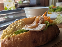 予約してお邪魔しました。靴は脱いで上がります。ソフトプレッツェルの鳥ハムサンドがメインのランチ。お野菜モリモリのプレート。お野菜は色々な味で楽しめます。自家製のパンに鳥ハムと人参ラペなどがサンド。ドリンク付き。どれもおいしかったです。自家製パン屋クッキーのテイクアウトも。かわいいログハウスの建物です。 (訪問:2025/10/12)