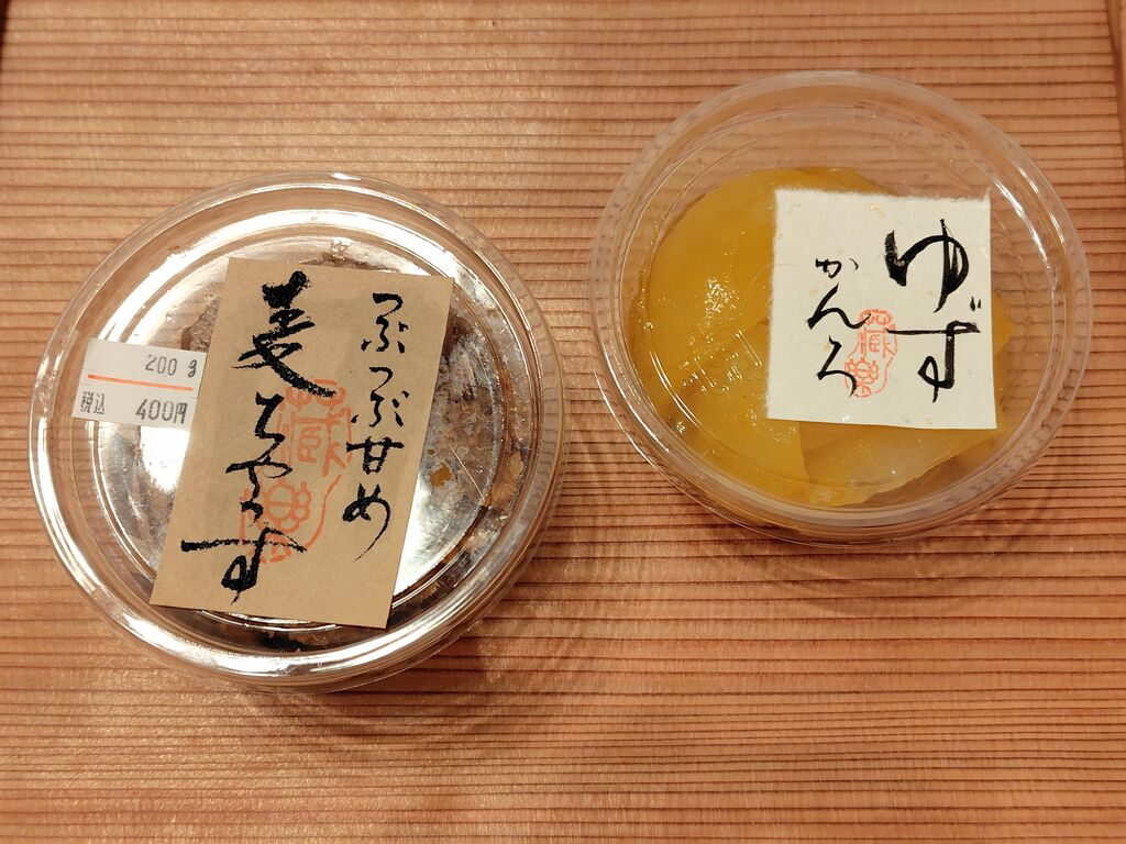 こちらのちゃうすというちょっと甘めのお味噌が好きで、買いに行きました。いつもあるのに、今日は仕込み中で、代わりに麦ちゃうすを勧められました。初めて見た商品だったのですが、お店でも初めて作ったそう。ツブツブのお味噌ですが、これでお味噌汁を作るが楽しみ。そしてこの季節限定の柚子のカンロもお目当てでした。柚子を時間をかけて何度も煮こぼして作るこの柚子カンロは毎年の私の楽しみ。柚子の皮の味が上品で、お茶でいただくのが至福の時です。 (訪問:2025/12/08)