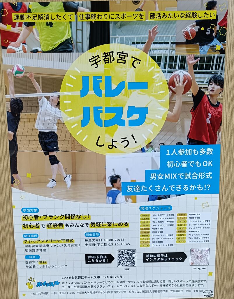 NEW近くの中央図書館に行った帰りに少し寄ってストレッチしてきました。こちらの明保野体育館やブレックスアリーナ、宇都宮大学陽東キャンパス体育館で、1人でも参加できるバレーやバスケが開催されているようですね。 (訪問:2025/12/12)