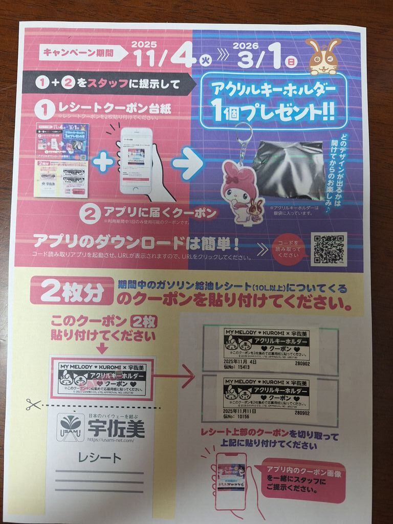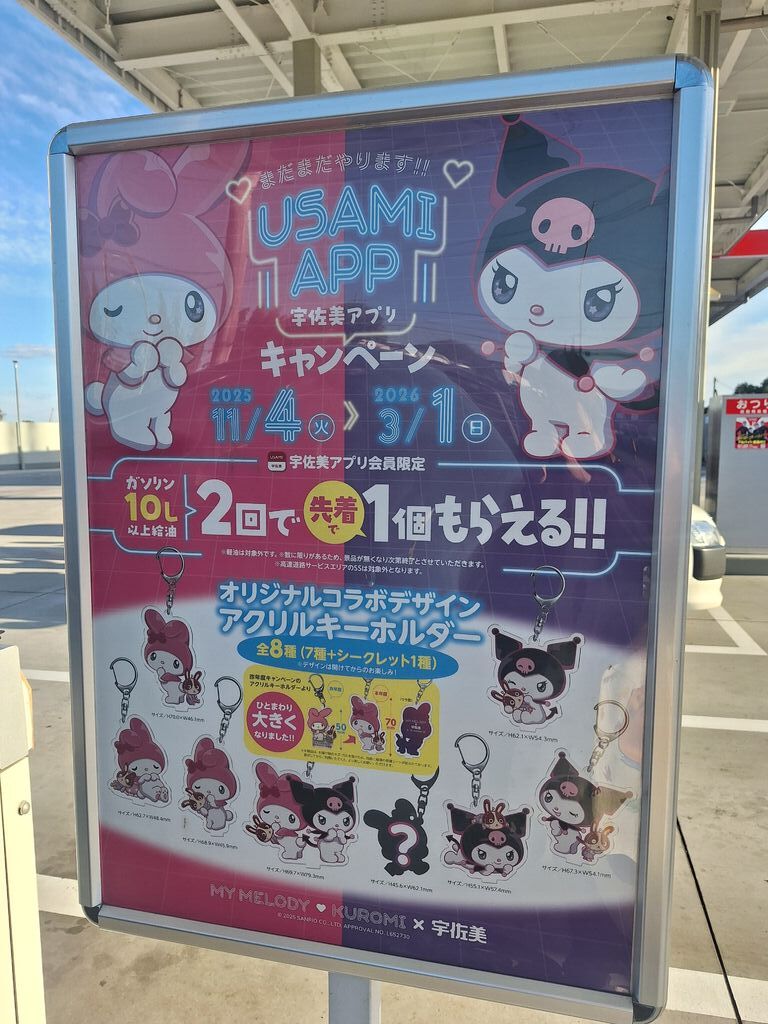 アプリの値引きクーポンを使用して給油に寄りました☆ガソリン10L以上給油2回&宇佐美アプリ会員に、 マイメロディやクロミの“オリジナルコラボデザインアクリルキーホルダー”プレゼントのキャンペーンが始まっていました!数量限定で人気なので早めに集めたいです(^ー^) (訪問:2025/11/04)